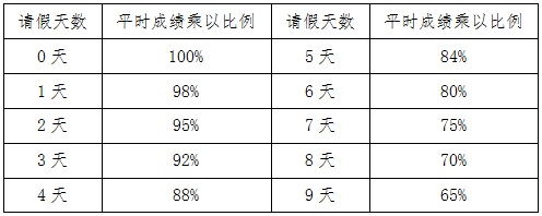 (1)平时成绩占总成绩的50%,其中《球友会实训阶段总结报告》成绩占10%、《球友会球友会员工实训验收成绩评定表》成绩占40%。另外,根据出勤请假情况对平时成绩进行调整,平时成绩乘以比例与请假天数关系如下: