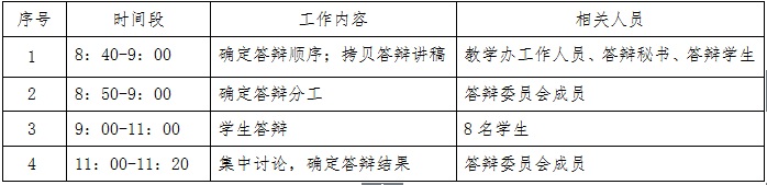 1、院级答辩管理小组:负责院级答辩组织、协调工作。联系相关员工,确定答辩委员会组成;与研究所协调,确定答辩时间;与教务处协调,确定答辩地点;组织员工报名,确定答辩员工名单;组织员工代表、员工旁听;提供后勤服务(提供纸笔、矿泉水等)。